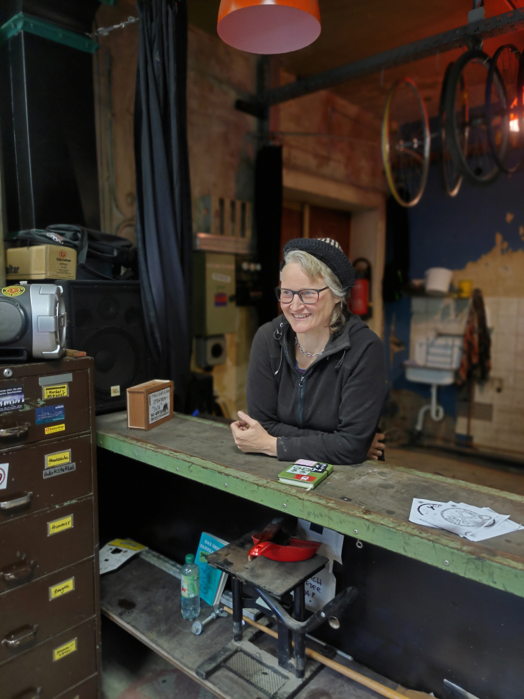Das Gelände im Leipziger Süden wird seit über dreißig Jahren von der Kinder- und Jugendwerkstatt KIJUWE bespielt. Diese ist ein offener Freizeittreff für „kreatives Schaffen“, mit Workshops, Proberäumen, einer Saatgut-Bibliothek und eben der Werkstatt, die L-MAG heute besucht. Janna (Foto) ist dort schon über 25 Jahre als Ehrenamtliche aktiv, auch im Umsonstladen ist sie involviert. Die Räumlichkeiten mit den Werkzeugen gibt es schon eine Weile. Bis vor zwei Jahren war dies eine offene Fahrrad-Selbsthilfewerkstatt für alle im Kiez und finanzierte sich über Fördermittel. Sogar eine bezahlte Stelle war drin. Als die Förderung schließlich wegbrach, standen eine Menge Veränderungen im Raum.